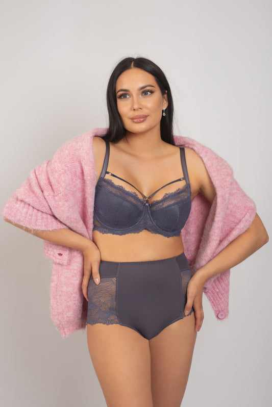 Кружевной бюстгальтер балконет на косточках - 1136, Серый с белым, 75-90 B-F