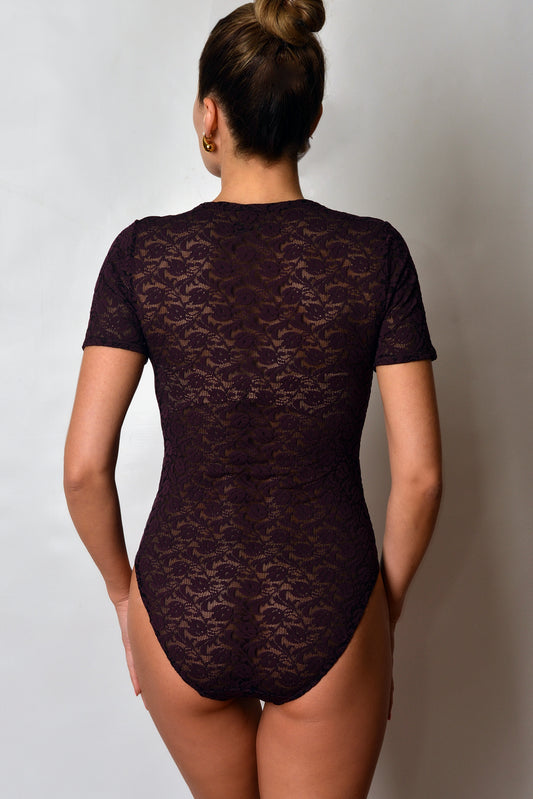 Элегантное кружевное боди с коротким рукавом - 9111, Сливовый, 40-46