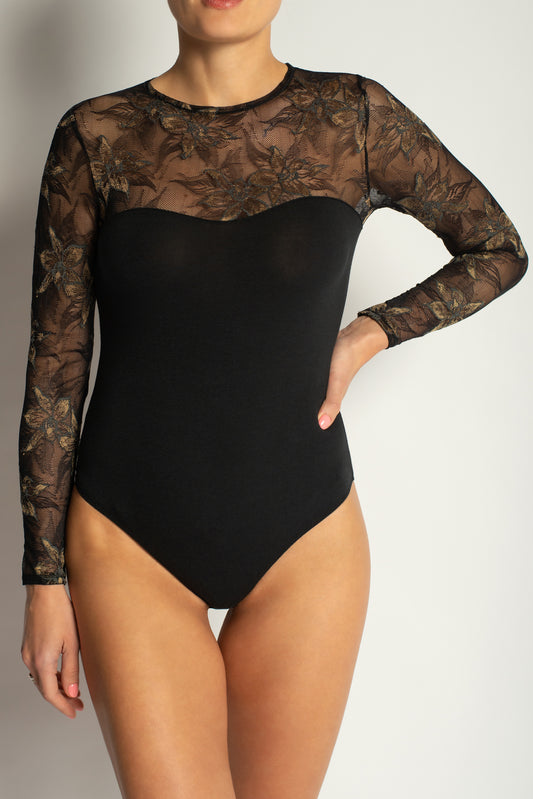 Элегантное боди с горлом и длинными рукавами из натурального хлопка и сетки - 9133, Черное, 36-46