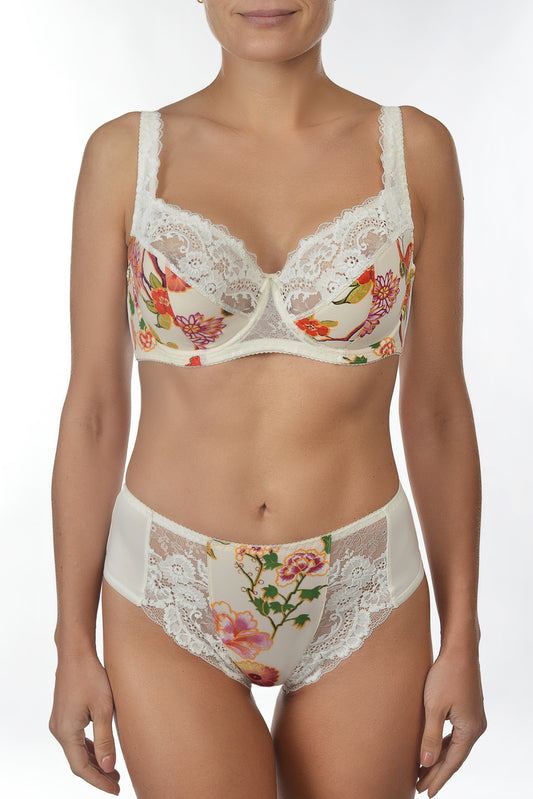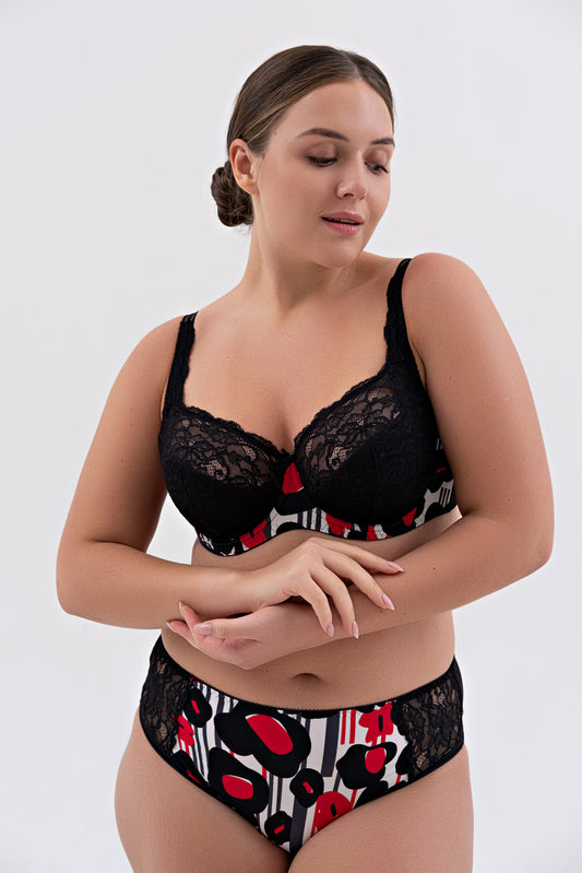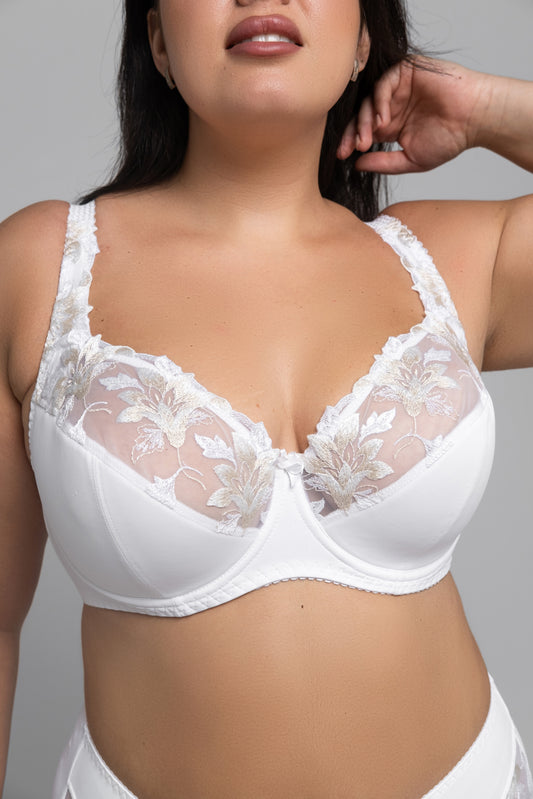 Верхняя часть чашки из кружева или вышивки красиво повторяет естественный контур груди, придавая изделию элегантность и превосходную воздухопроницаемость. Косточки обеспечивают надёжную фиксацию и поддержку, обеспечивая плотное прилегание.
